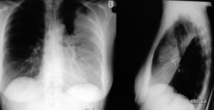 7.16.  Bild in zwei Teilen: Es handelt sich nicht um einen Fehler in der Thorax-Projektion (verdrehter Thorax). Es lieget auch keine artifizielle. Die seitlichen Anteile der linken Thoraxhöhle sind frei von Lungenstruktur.  Die linke Lunge ist zu einer Kompressionsatelektase verdichtet.